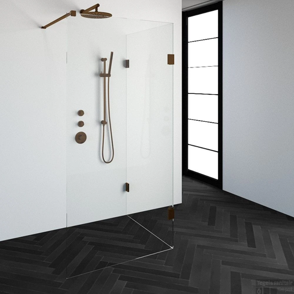 Deze complete inloopdouche bestaat uit twee inloopwanden met koper beslag. Inclusief glasbehandeling. De hoogte van de inloopdouche is 200 cm. Hij is 98,3 cm breed en 87,7 cm diep. Deze inloopdouche straalt luxe uit door zijn design en kleur.