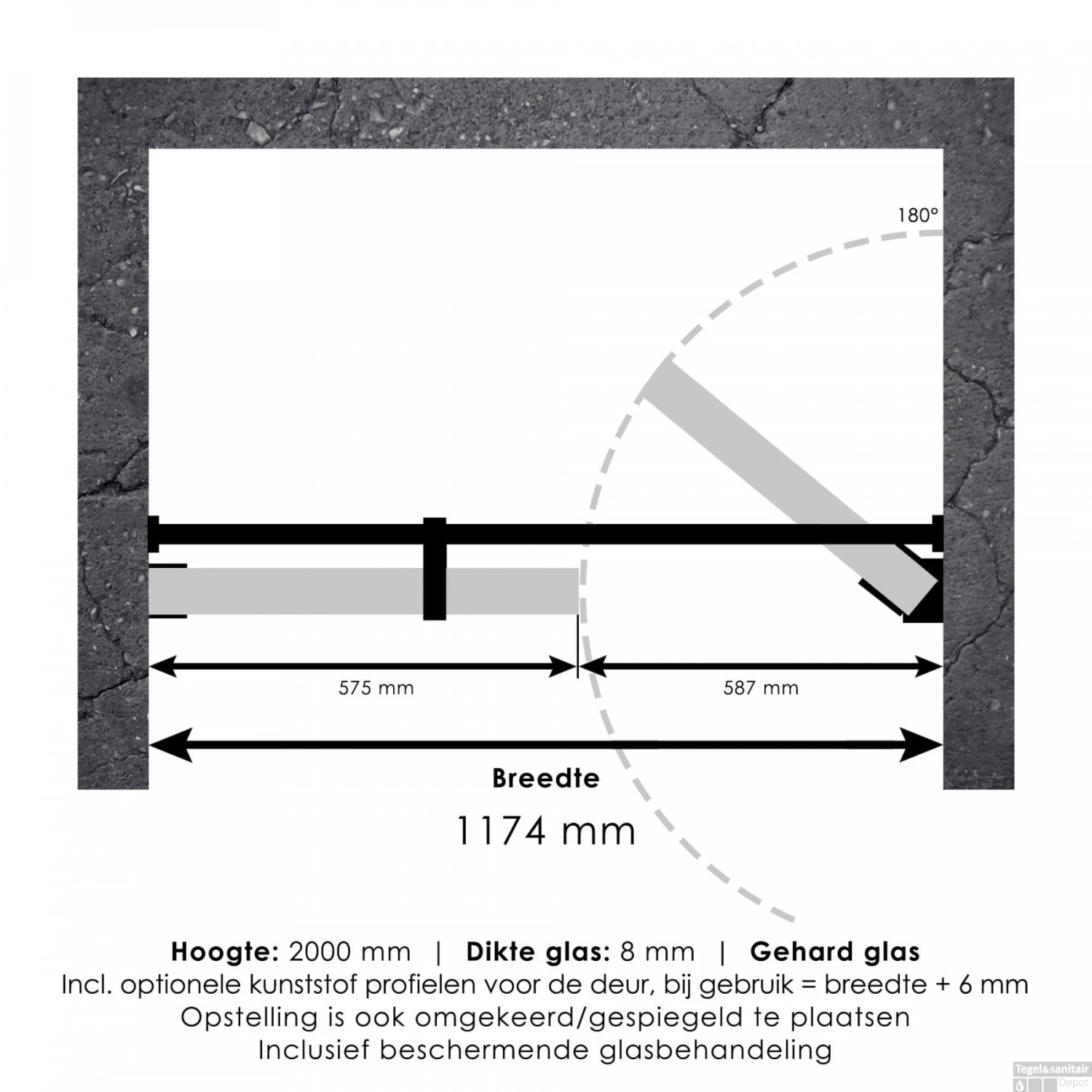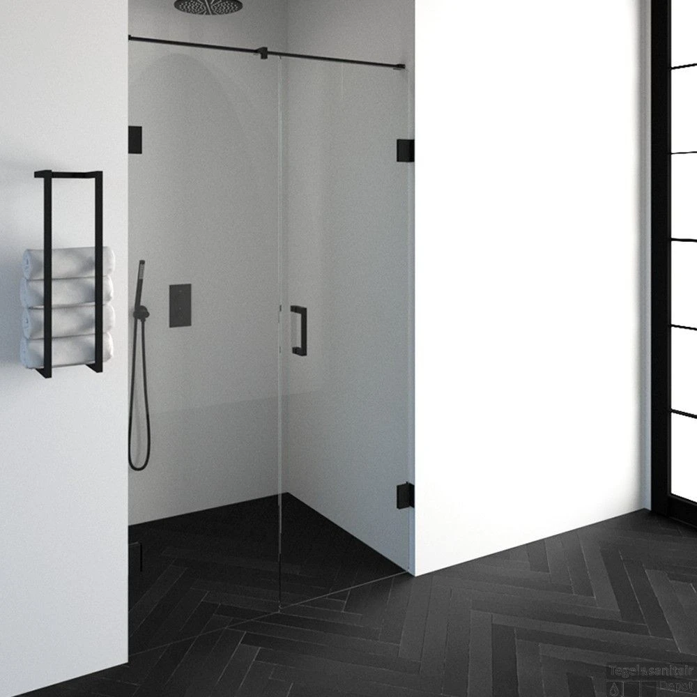 Deze complete nisdeur bestaat uit een inloopwand en draaideur met Mat Zwart beslag. Inclusief glasbehandeling en optionele kunststof profielen. De hoogte is 200 cm. Deze nisdeur straalt luxe uit door zijn design en kleur.