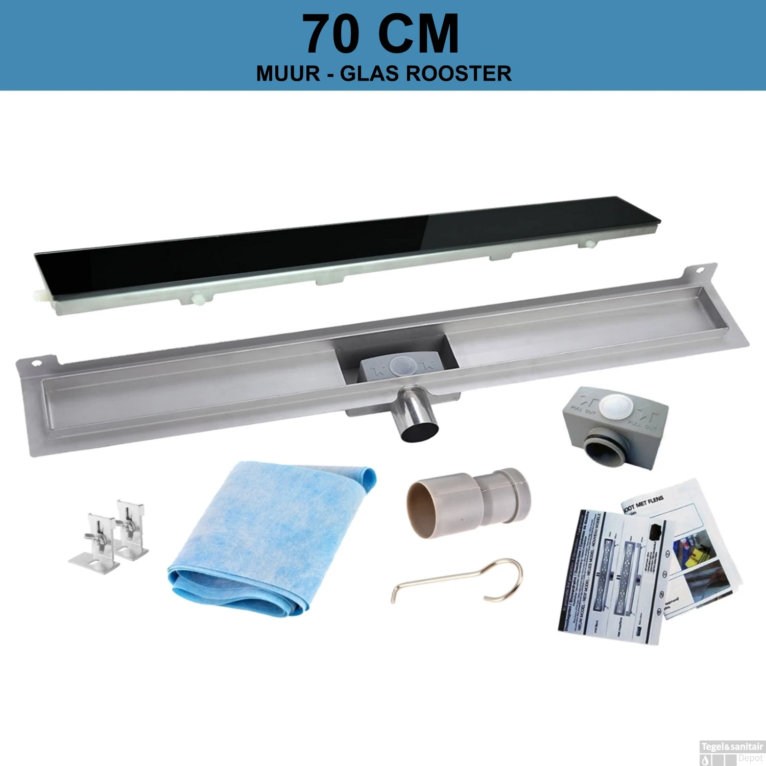 RVS Douchegoot Muurflens met uitneembaar sifon 70x7cm 6,7cm diep GLAS ROOSTER