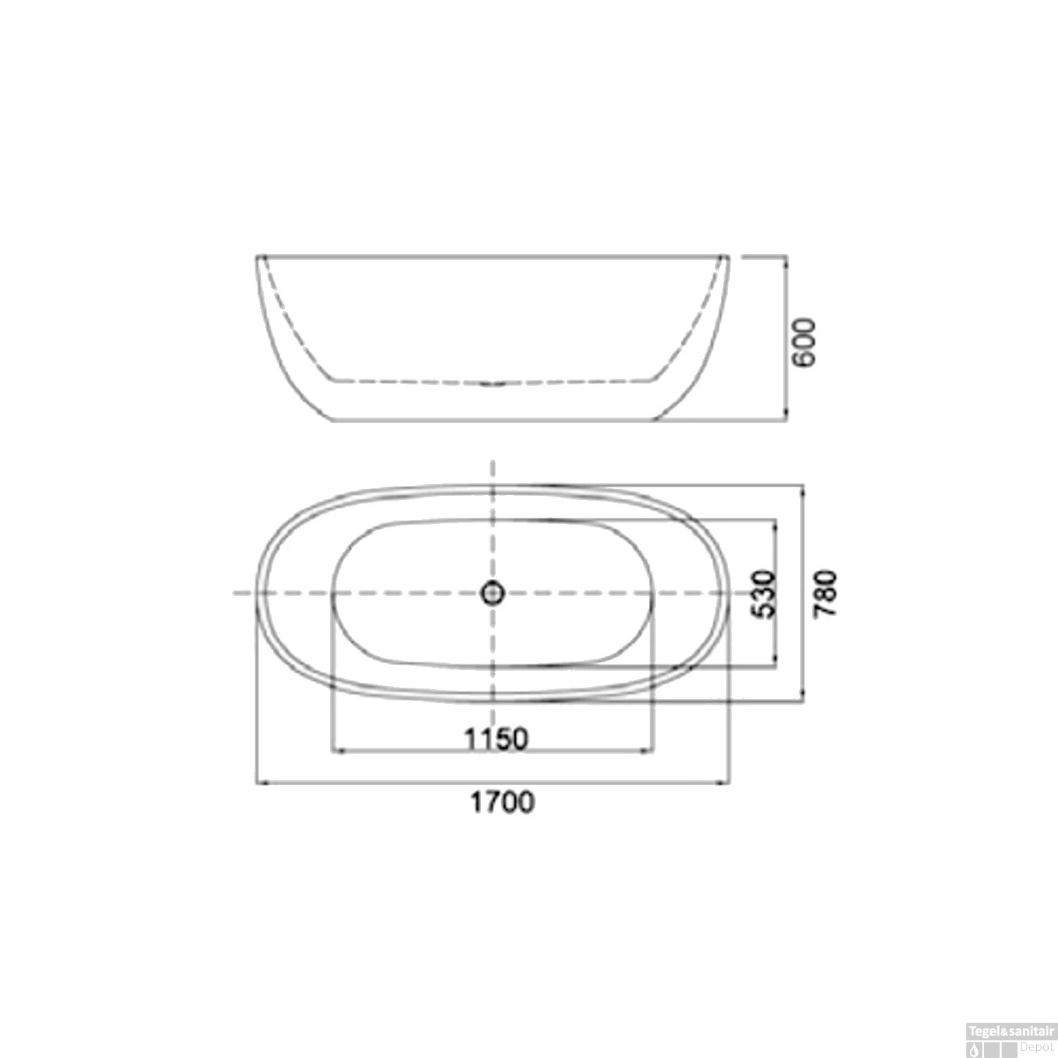 Het bad is 170cm lang en 78cm breed, genoeg om gezellig met zijn tweeën in te zitten. De afvoer zal niet in de weg zitten want die zit netjes in het midden. De rand van het bad is 3cm breed. Er zit overigens een bad afvoer bij het bad.