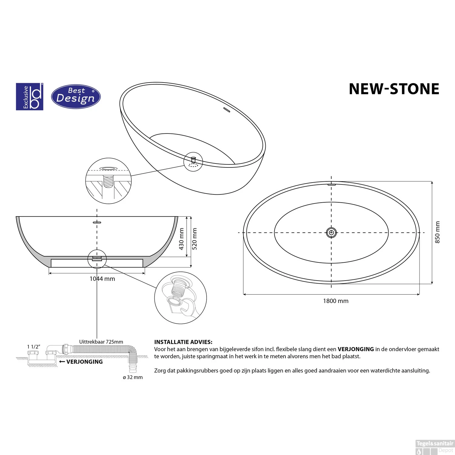 Solid surface is een duurzaam oppervlaktemateriaal. Dat komt door de voordelen van de twee hoofdmaterialen aluminiumhydroxide en acryl die samen zijn gevoegd. De combinatie maakt uw bad vocht- en vlekbestendig, weert bacteriën, laat zich bewerken als hout en toont keer op keer een oppervlakte als nieuw. Bovendien is het materiaal ook nog een milieuvriendelijk en biologisch verantwoord. Het bad wordt geleverd met een sifon!