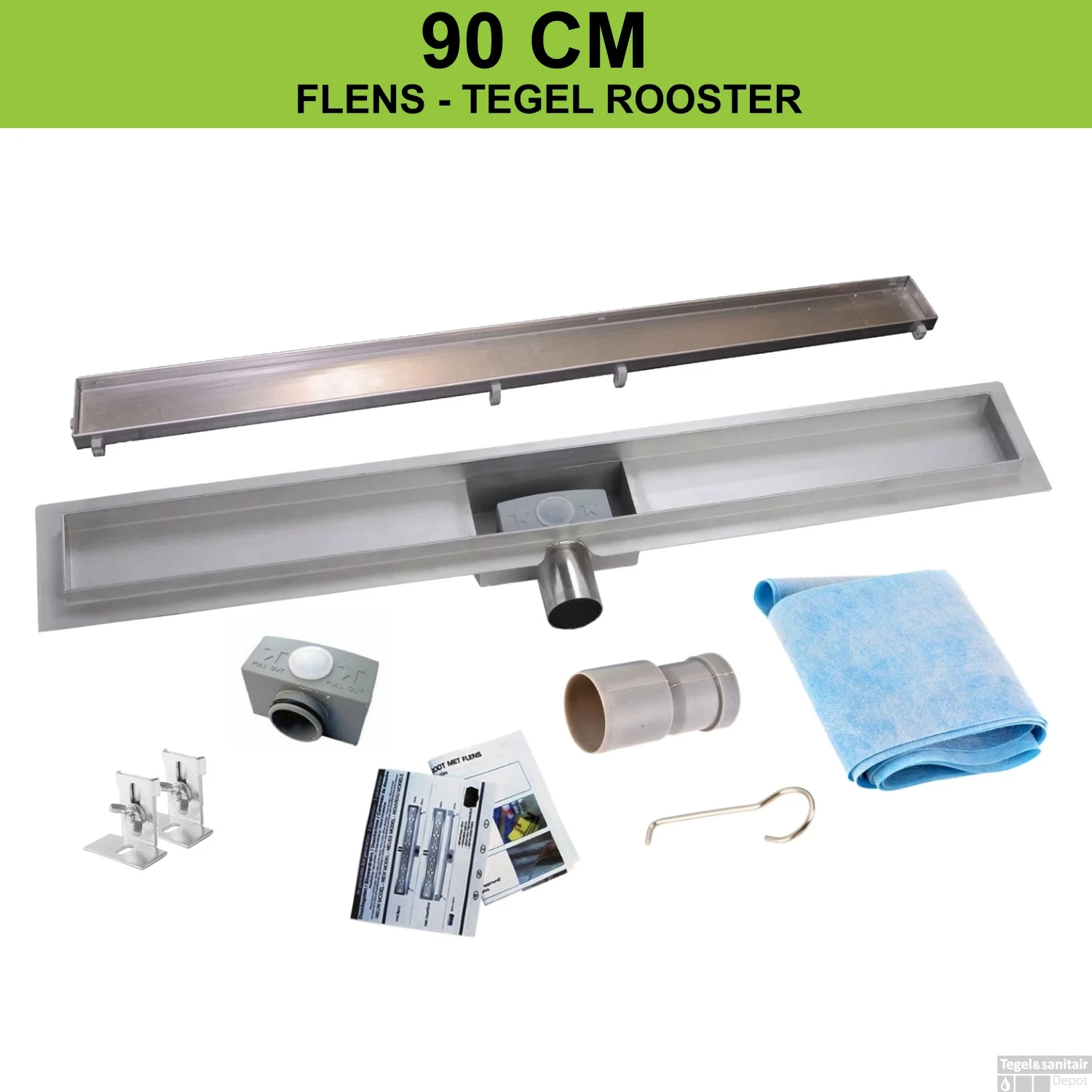 RVS Douchegoot flens met uitneembaar sifon 90x7cm 6,7cm diep TEGEL ROOSTER